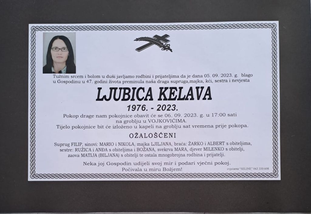 U utorak, 5. rujna 2023. godine u 47. godini života blago u Gospodinu preminula je Ljubica Kelava.