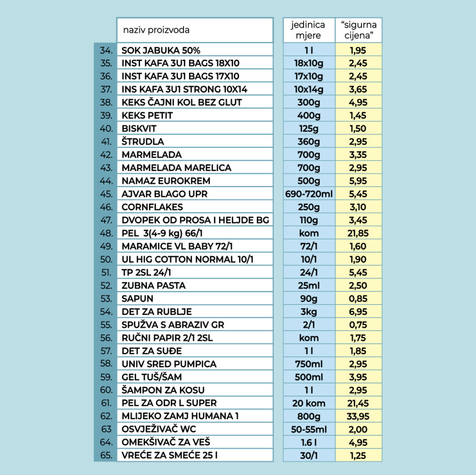 Ovo je popis 65 prehrambenih i higijenskih proizvoda koje je Vlada FBiH snizila i zaključala
