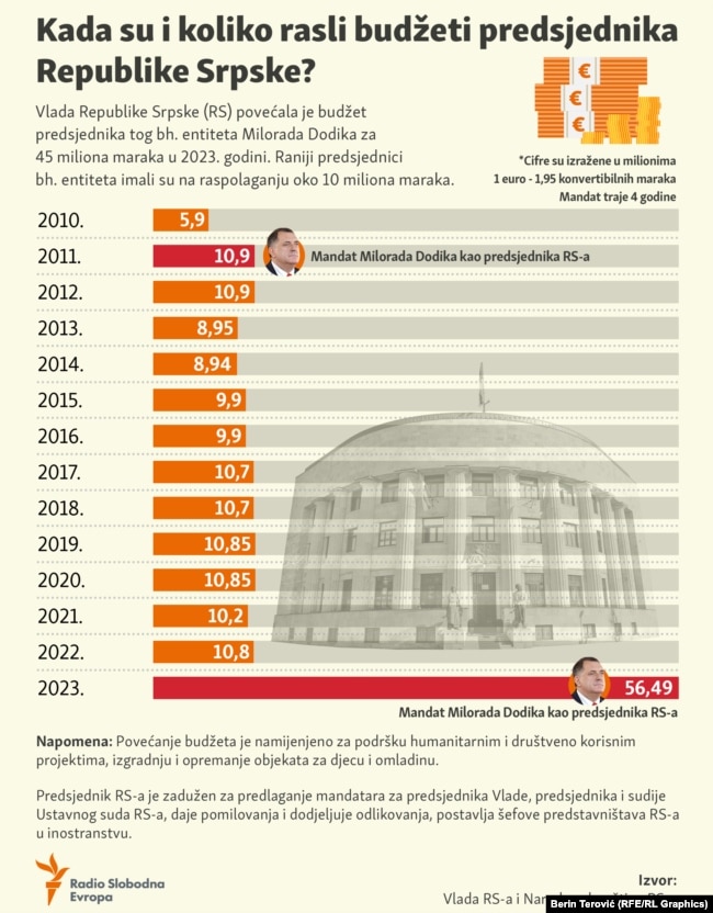 Budžet predsjednika ovog bh. entiteta je duže od decenije iznosio oko pet miliona eura, da bi doživio pravu “eksploziju” kada se Dodik vratio na ovu funkciju krajem 2022. godine.