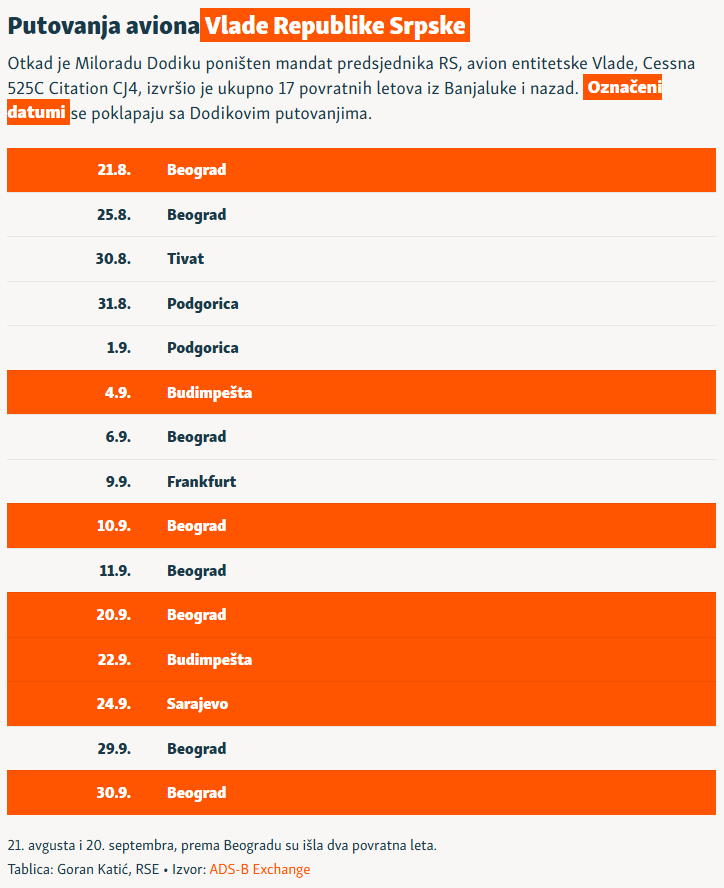 Do zaključenja teksta, iz Vlade RS nije odgovoreno na upit RSE da li je Dodik koristio njihov avion prilikom ovih letova.