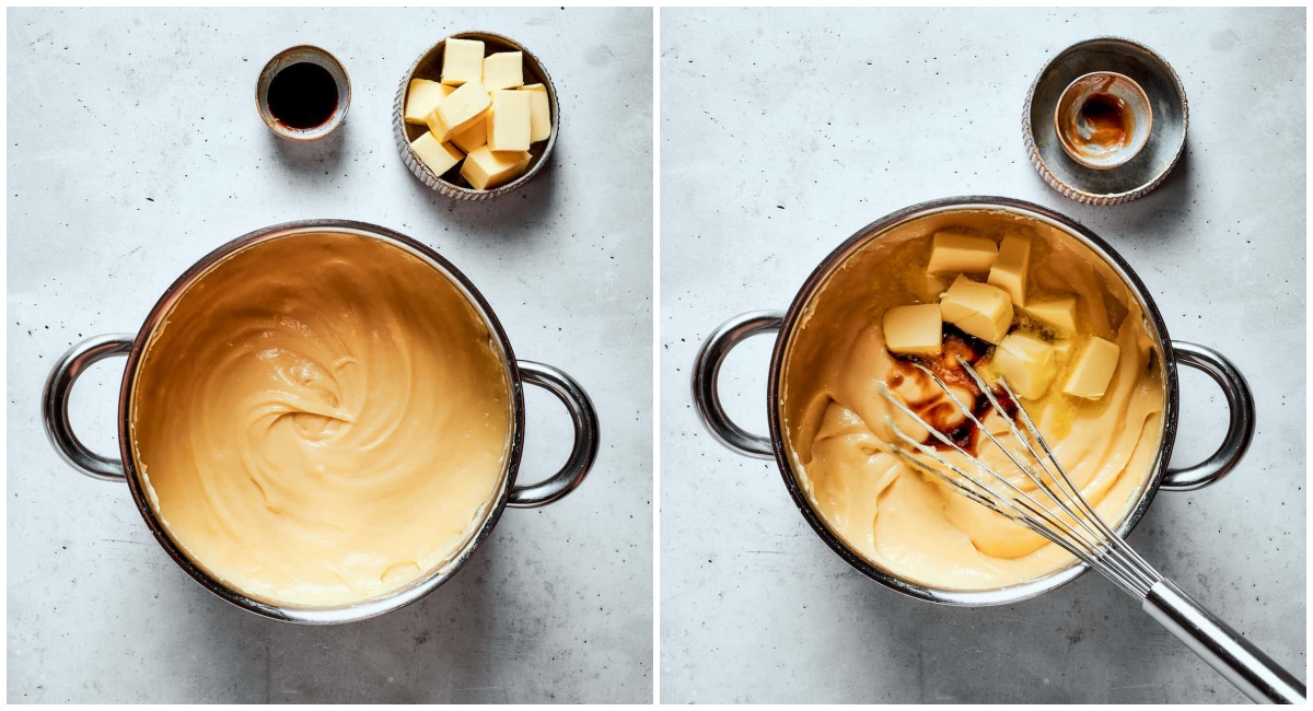 - Maknite s vatre, dodajte maslac i vaniliju, i miješajte dok ne postane svilenkasta i sjajna.