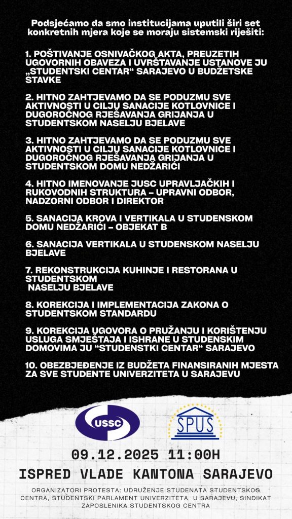 Studenti Sarajevskog univerziteta koji žive u Domu Bjelave zakazali su nove proteste za sutra u 11 sati ispred Vlade Kantona Sarajevo.