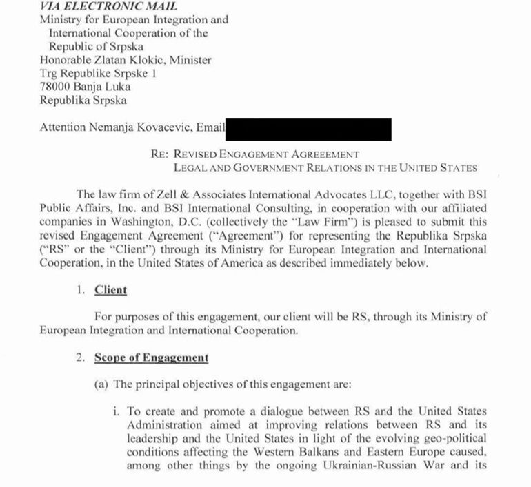 Nepuna četiri dana nakon što je u Američkom kongresu usvojen Zakon o demokratiji i prosperitetu Zapadnog Balkana, koji je sam po sebi nepovoljan po nacionaliste i secesioniste, američko Ministarstvo pravde objavilo je aneks ugovora koji je RS potpisala s lobističkom kućom Zell & Associates, otkriva Fokus.